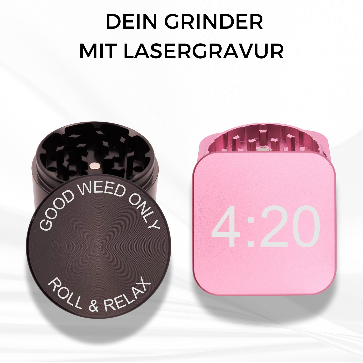 Mach deinen Grinder zu einem echten Unikat. Mit präziser Lasergravur verewigst du Namen, Sprüche oder Daten dauerhaft auf hochwertigem Aluminium – stilvoll, klar und individuell.